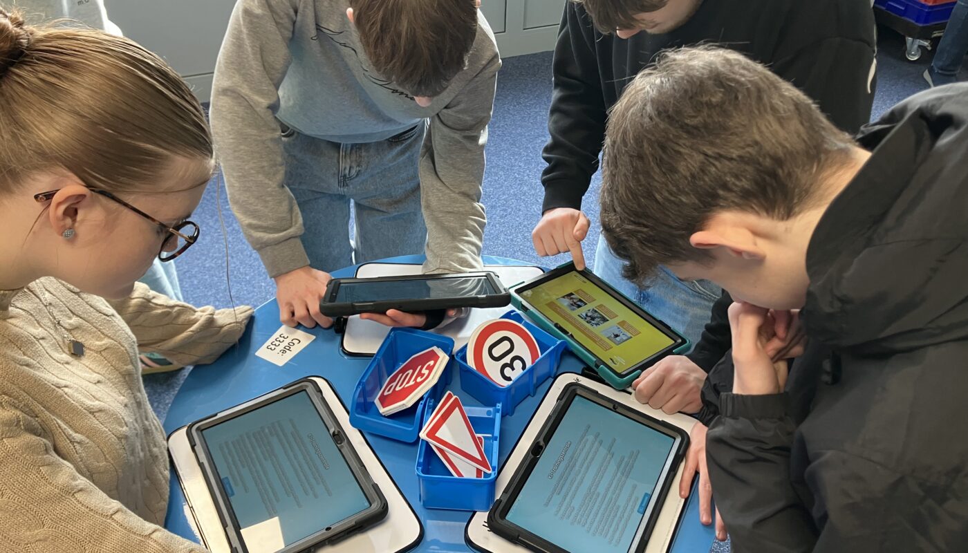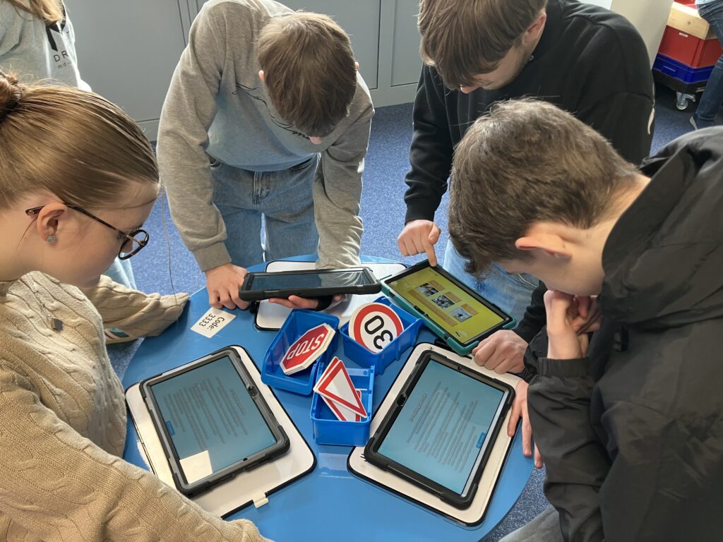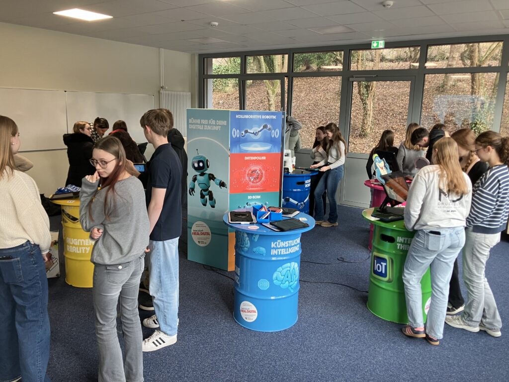 Vor diesem Hintergrund gastierte die Erlebnisausstellung „Deine Zukunft #REAL:DIGITAL“ in der letzten Woche für drei Tage an der Marie-Durand-Schule. Anna-Lena Klein, Lehrerin im Fach Arbeitslehre und gemeinsam mit ihren Kolleginnen verantwortlich für den Übergang von Schule in den Beruf, organisierte für alle Klassen der Jahrgänge 8-10 einen jeweils 90-minütigen Workshop unter der Leitung von zwei Digi-Coaches. Zahlreiche interaktive Mitmachangebote aus den Bereichen künstlicher Intelligenz, kollaborativer Robotik über Internet der Dinge, Augmented Reality, Sensorik, Verschlüsselung und 3D-Scan bis hin zu Big Data stellten die Lernenden an acht Stationen in Kleingruppen vor praxisorientierte Aufgaben. Ausgestattet mit Tablets lernten alle Teilnehmer auf motivierende Weise unter spielerischer Anwendung digitaler Schlüsseltechnologien, dass die Digitalisierung nahezu alle Berufe beeinflusst.