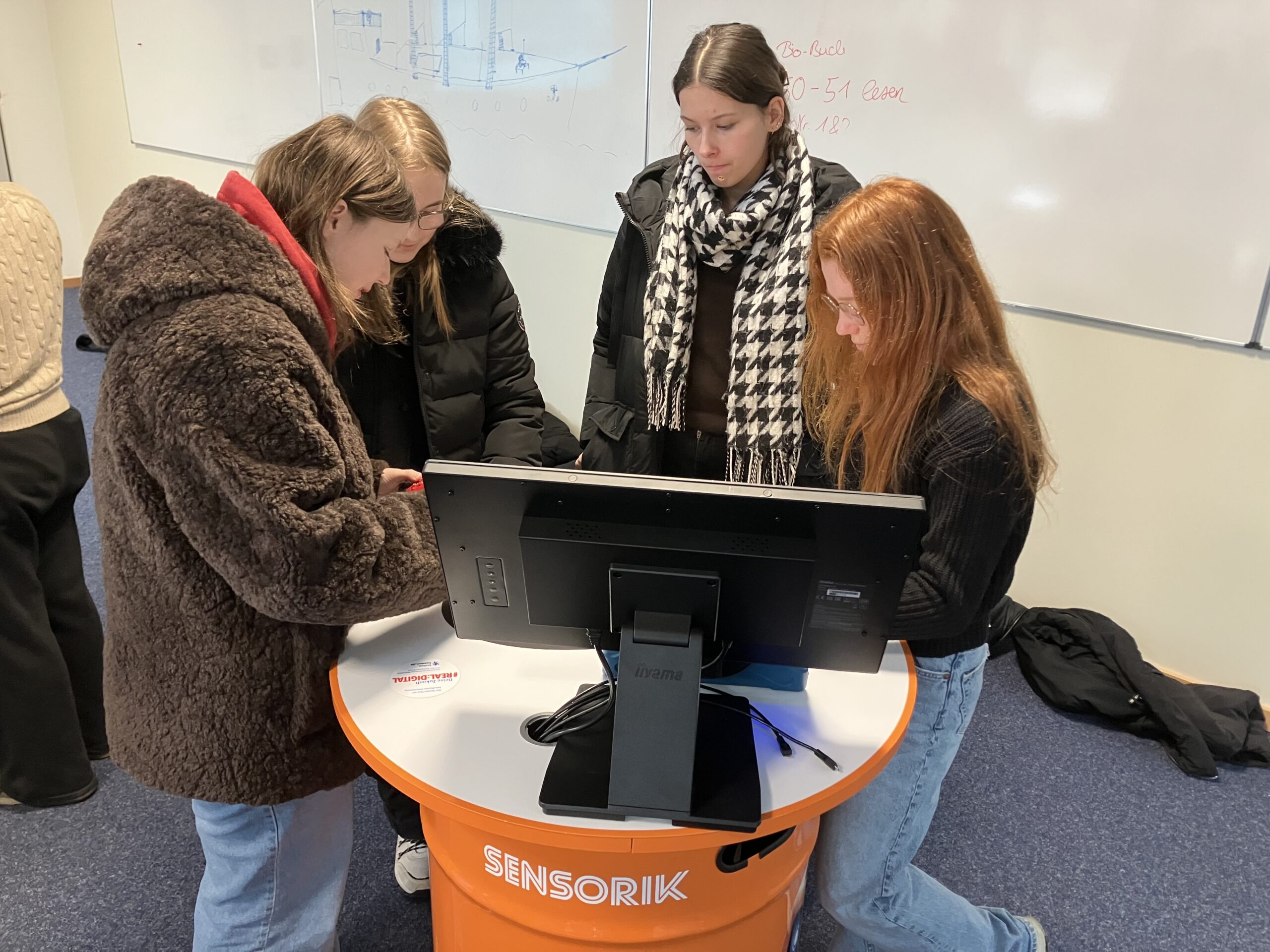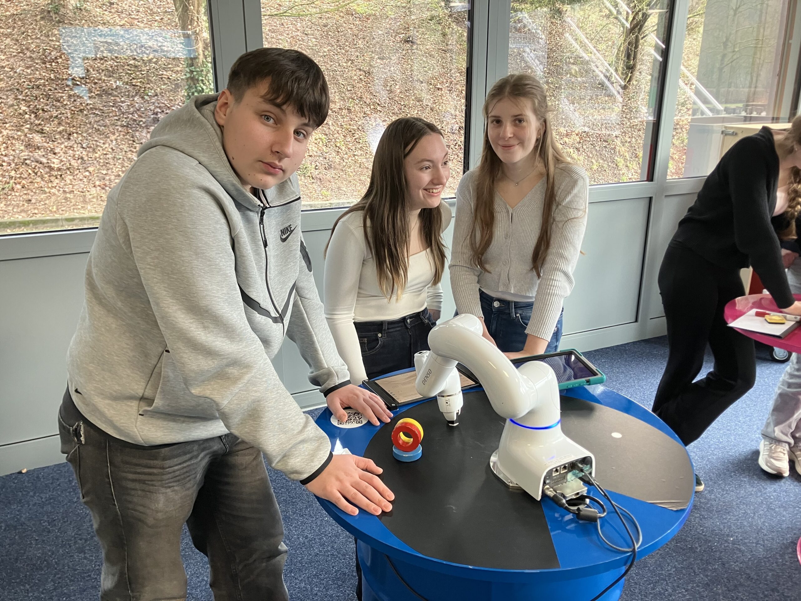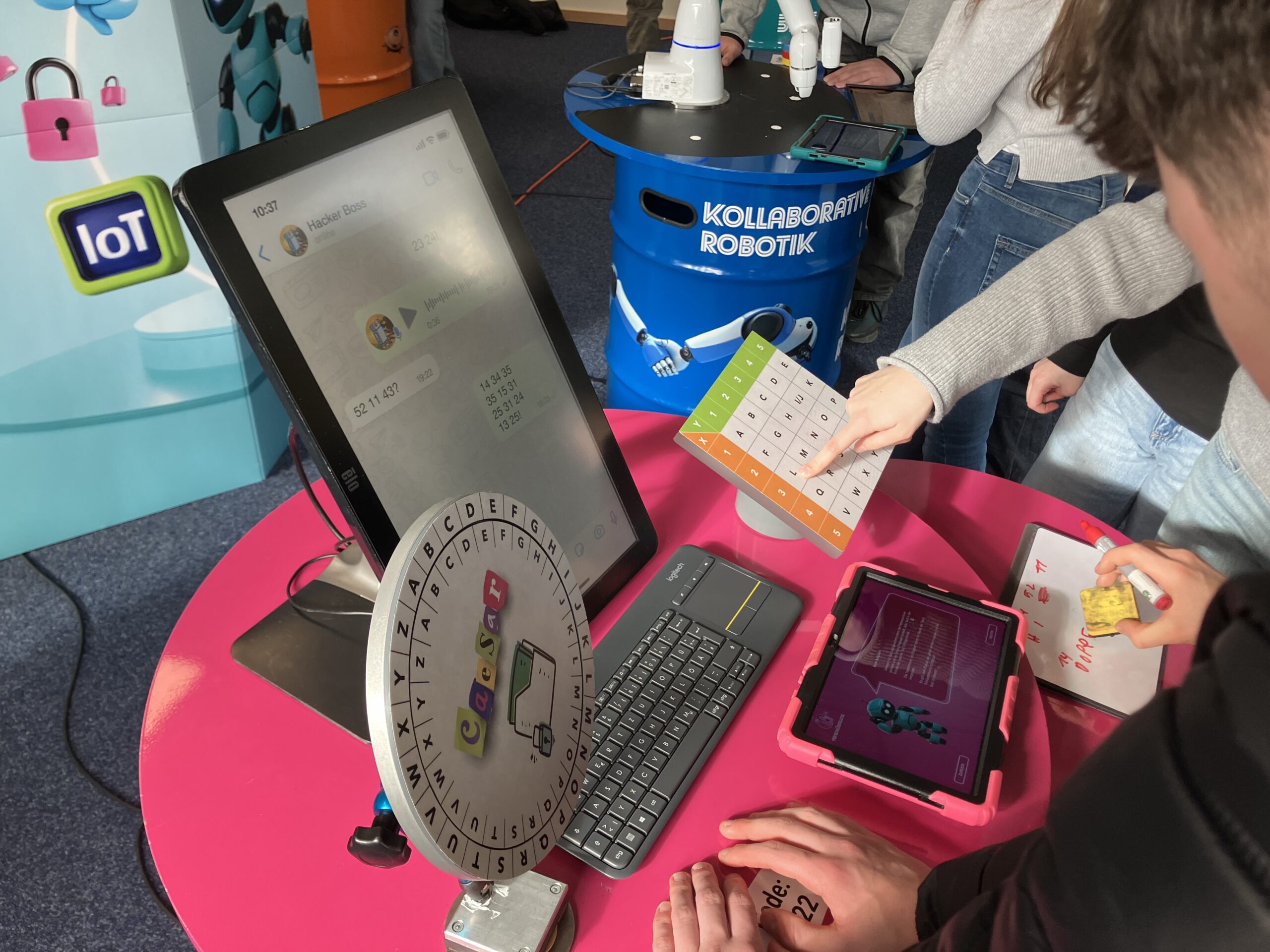 Vor diesem Hintergrund gastierte die Erlebnisausstellung „Deine Zukunft #REAL:DIGITAL“ in der letzten Woche für drei Tage an der Marie-Durand-Schule. Anna-Lena Klein, Lehrerin im Fach Arbeitslehre und gemeinsam mit ihren Kolleginnen verantwortlich für den Übergang von Schule in den Beruf, organisierte für alle Klassen der Jahrgänge 8-10 einen jeweils 90-minütigen Workshop unter der Leitung von zwei Digi-Coaches. Zahlreiche interaktive Mitmachangebote aus den Bereichen künstlicher Intelligenz, kollaborativer Robotik über Internet der Dinge, Augmented Reality, Sensorik, Verschlüsselung und 3D-Scan bis hin zu Big Data stellten die Lernenden an acht Stationen in Kleingruppen vor praxisorientierte Aufgaben. Ausgestattet mit Tablets lernten alle Teilnehmer auf motivierende Weise unter spielerischer Anwendung digitaler Schlüsseltechnologien, dass die Digitalisierung nahezu alle Berufe beeinflusst.